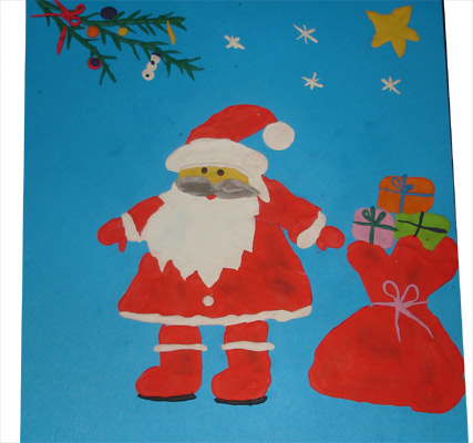 2. Mikołaj malowany czerwoną farbką plakatową i pastą do zębów, głównie rączkami i paluszkami, z workiem, wśród śniegu idzie, przynieść prezenty wszystkim dzieciom. Autor: Julia