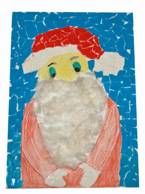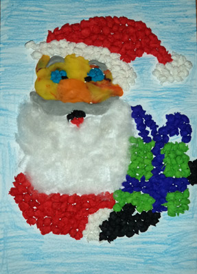 Tata napisał: Portret Mikołaja zrobił mój 6 letni syn Piotrek. Ponieważ nie mógł się zdecydować na jedną połączył ze sobą kilka technik: czapka i prezent z kulek z bibuły, broda z waty, buzia z plasteliny a tło pomalowane kredką.